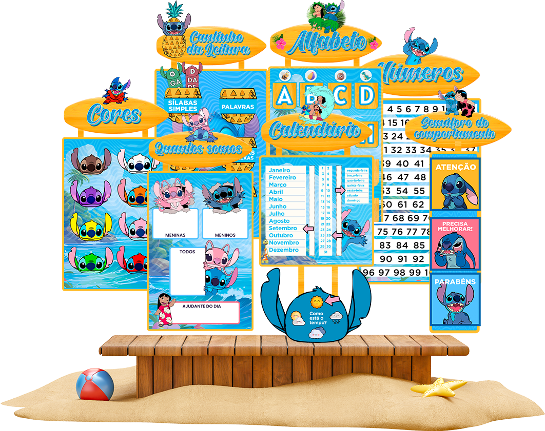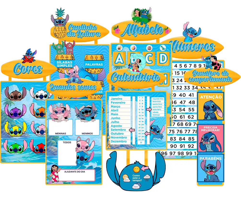 O primeiro e único kit completo de decoração Lilo & Stitch pensado especificamente para professoras que querem: